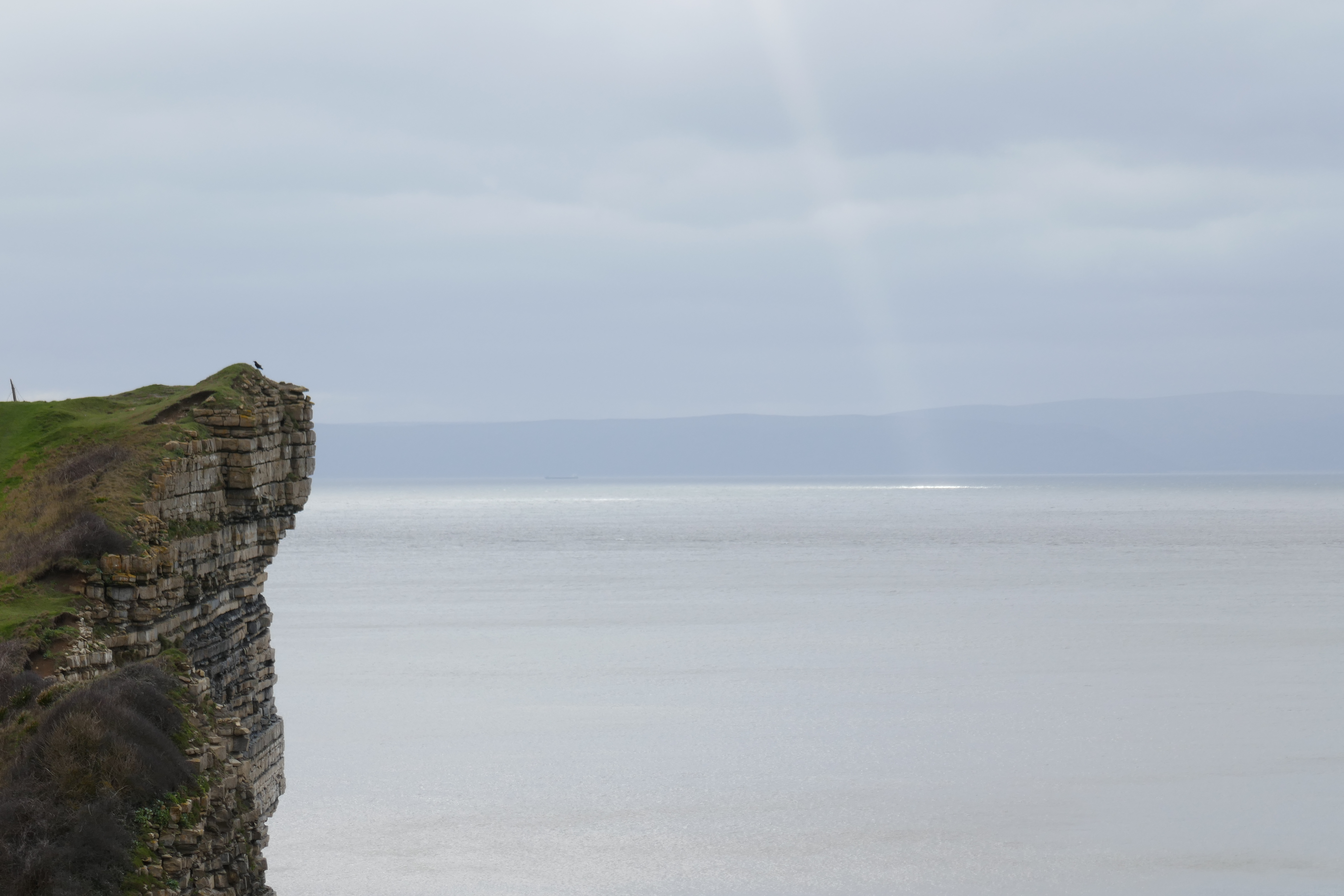 After returning to the stony beach at Llantwit Major, I climbed steps out of the narrow valley, admiring the cliffs on the other side. The path then faithfully followed the edge of the cliffs, close to my left. As they looked pretty unstable, with a few large cracks and landslips, I took care to keep away from their vertical drop. They are made of the Blue Lias, a distinctive rock formation of Jurassic age, composed of alternating layers of grey limestone and shale, the limestone bands around 20 centimetres thick and standing slightly proud, the shale layers a little thinner, slightly darker and more easily eroded. On the foreshore the limestone formed wave cut platforms, like pavements, the smooth grey rock cut by regular joints or cracks. Periodically the path dropped down into a steep sided valley, flanked by slopes covered with low trees and bushes, bare of leaves at this time of year, a few yellow gorse flowers relieving the drab winter colours. I always seem to walk this section in winter, the paths muddy and slippery, the sky overcast, although not without beauty as the sun sent shafts of light through gaps in the clouds. Today I was joined on the trail by dog walkers and elderly couples, all wrapped up against the cold wind.